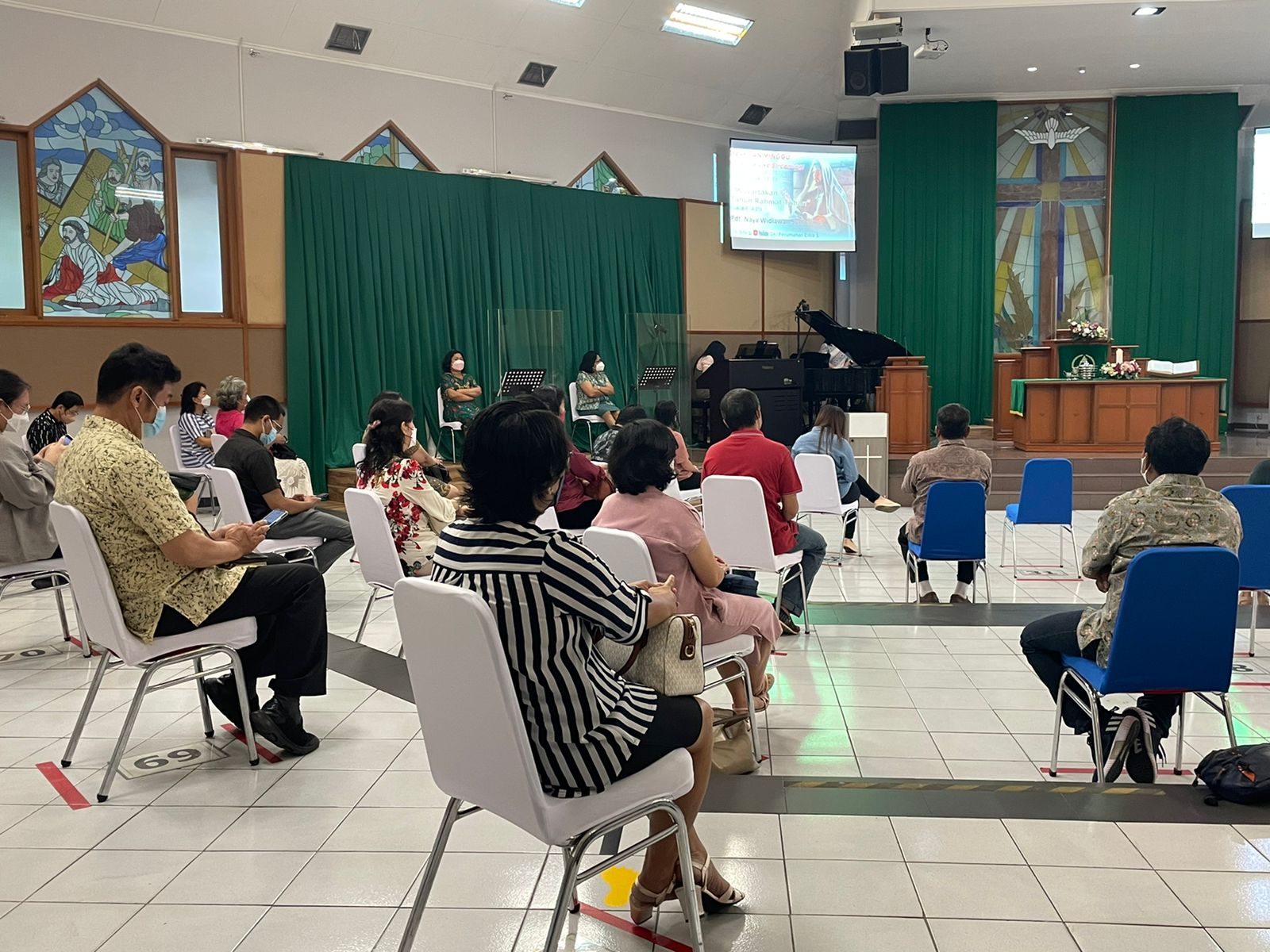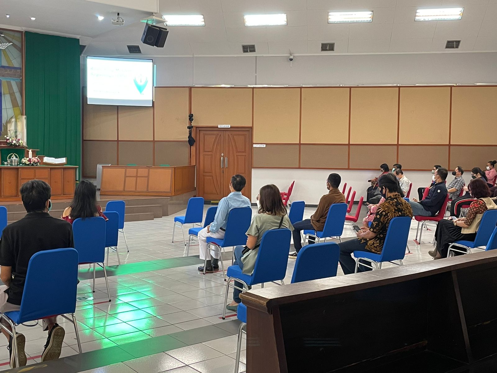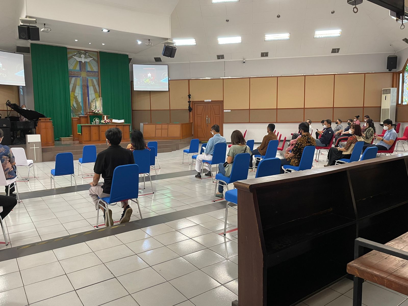 Setelah melakukan prosedur kesehatan yang ditetapkan dan melakukan ceck barcode yang telah diterima, umat mengikuti ibadah dengan penuh hikmat dan sukacita.