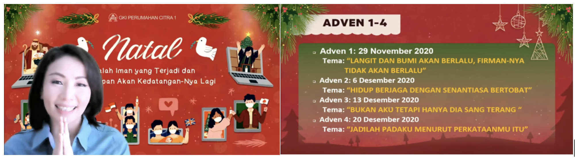 Kegatan Natal tahun ini diawali dengan Minggu Adven 1, pada 29 November 2020 hingga Adven 4, 20 Desember 2020. Dengan tema-tema Adven yang menarik dan sesuai dengan kondisi saat ini, umat dapat terberkati melalui setiap khotbah yang disampaikan oleh pendeta setiap minggunya. Pada Minggu Adven 1, Ketua Panitia Natal 2020, Siti Rohana Zainab, menyampaikan kata pembuka beserta informasi seputar kegiatan selama masa Adven, Natal, Akhir Tahun, dan Awal Tahun.